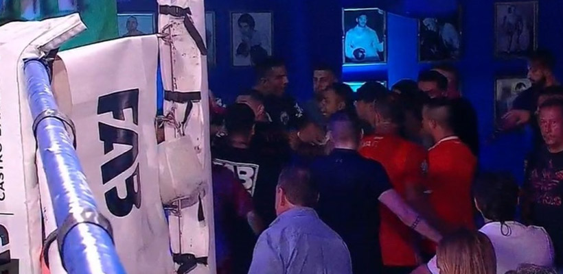 Después de algunos segundos, y viendo que la violencia escalaba y que la gresca era cada vez más generalizada, el árbitro ordenó que los boxeadores bajaran del ring.