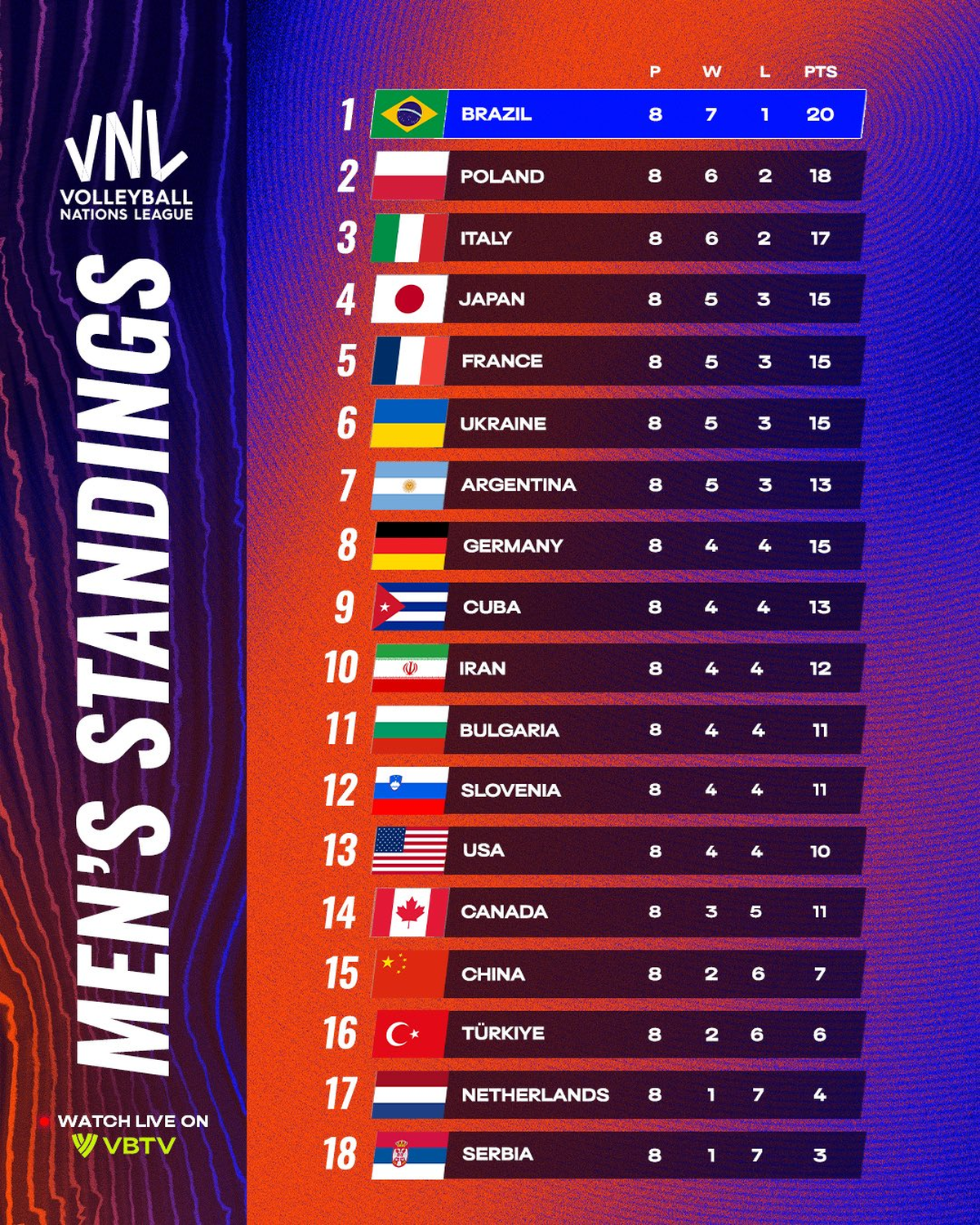 Las finales de la VNL se jugarán entre el 30 de julio y el 3 de agosto en China, país anfitrión. Allí competirán los 7 equipos mejor ubicados en la tabla general más el seleccionado local. Los cruces serán de eliminación directa: 1° vs. 8°, 2° vs. 7°, 3° vs. 6° y 4° vs. 5°.