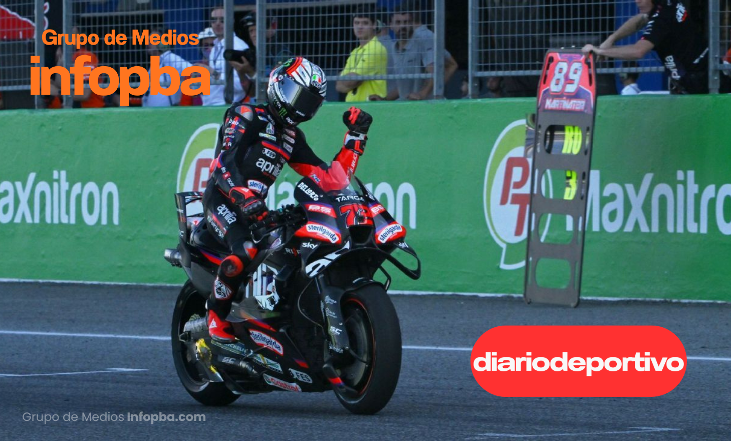 Entró a la última vuelta con seis segundos de ventaja sobre Pedro Acosta y hasta tuvo margen para comenzar el festejo antes de cruzar la bandera a cuadros. Con este resultado, se convirtió en el primer piloto en ganar tres carreras seguidas con Aprilia y sacó chapa de gran candidato al campeonato.
