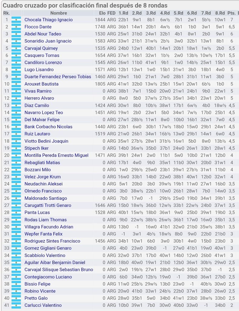 El título quedó en manos de Chocala con 7 unidades, seguido por Fiocco con 6,5, mientras que el pergaminense quedó a tan solo medio punto del podio, en una actuación que lo volvió a posicionar entre los mejores del país.